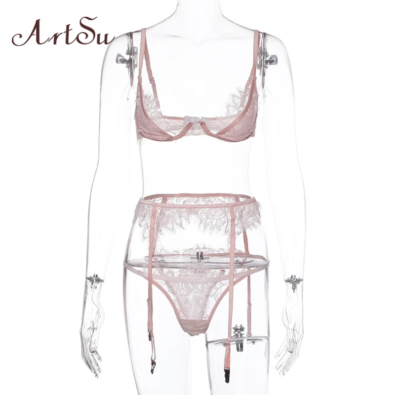 astounding ArtSu Straps Pink Lace Bra And Panty Set Sexy Skinny Intimates Lingerie Set Women Bralette Lace Bri