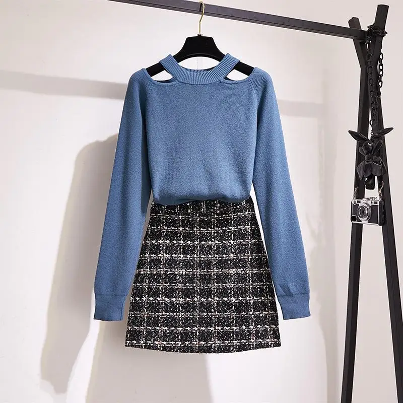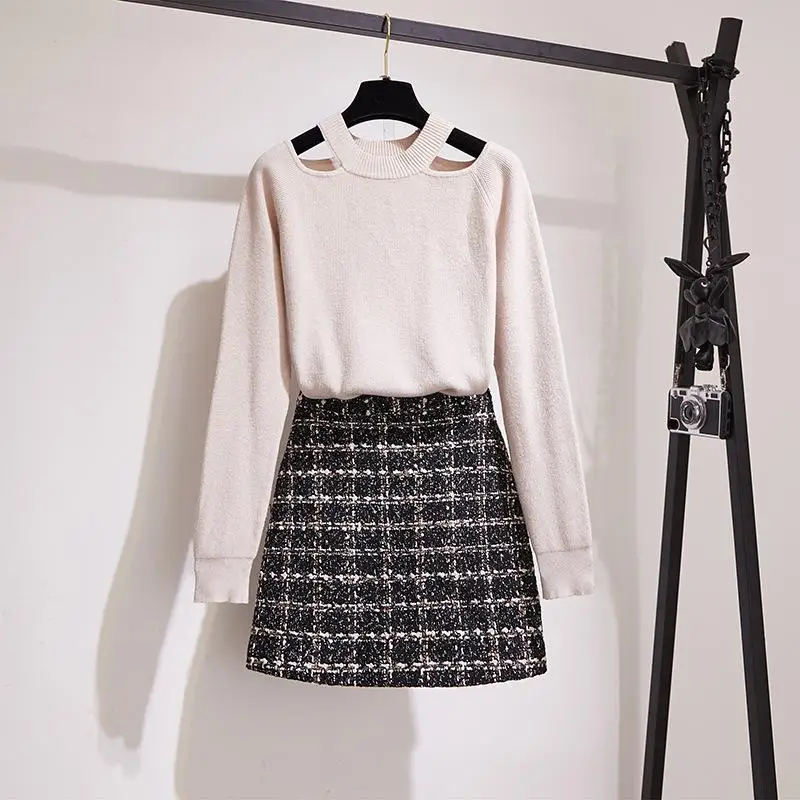 buy ICHOIX Korean style women 2 Piece Outfits knitted sweater plaid mini Skirt Set casual elegant ladie