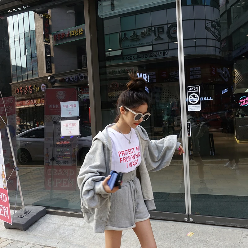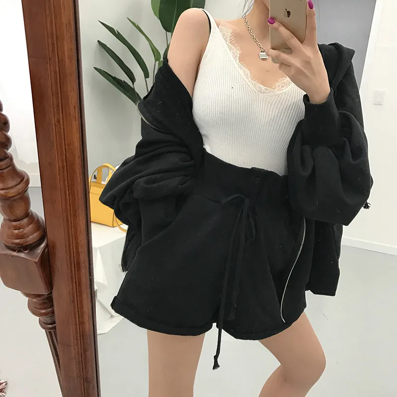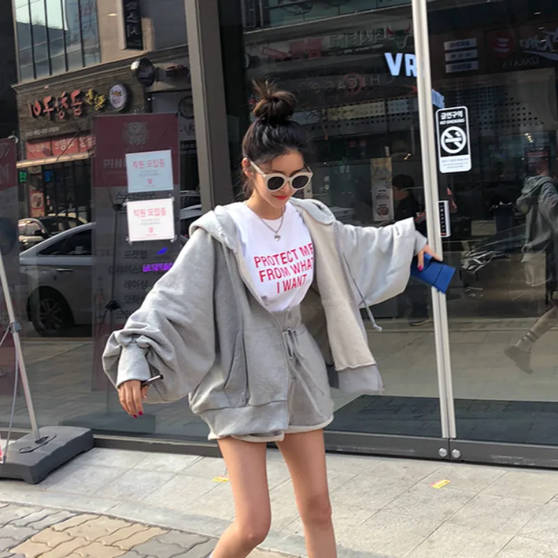 Best Women Autumn Cotton Solid 2two Piece Set Outfits Female Hooded Zipper Puff Sleeve Long Sweatshirts
