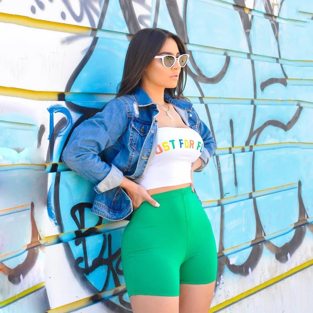 Finest Letters Print Two Pieces Set Woman Off Shoulder Wrap Chest+ Skinny Mini Tight Shorts Night Club Out