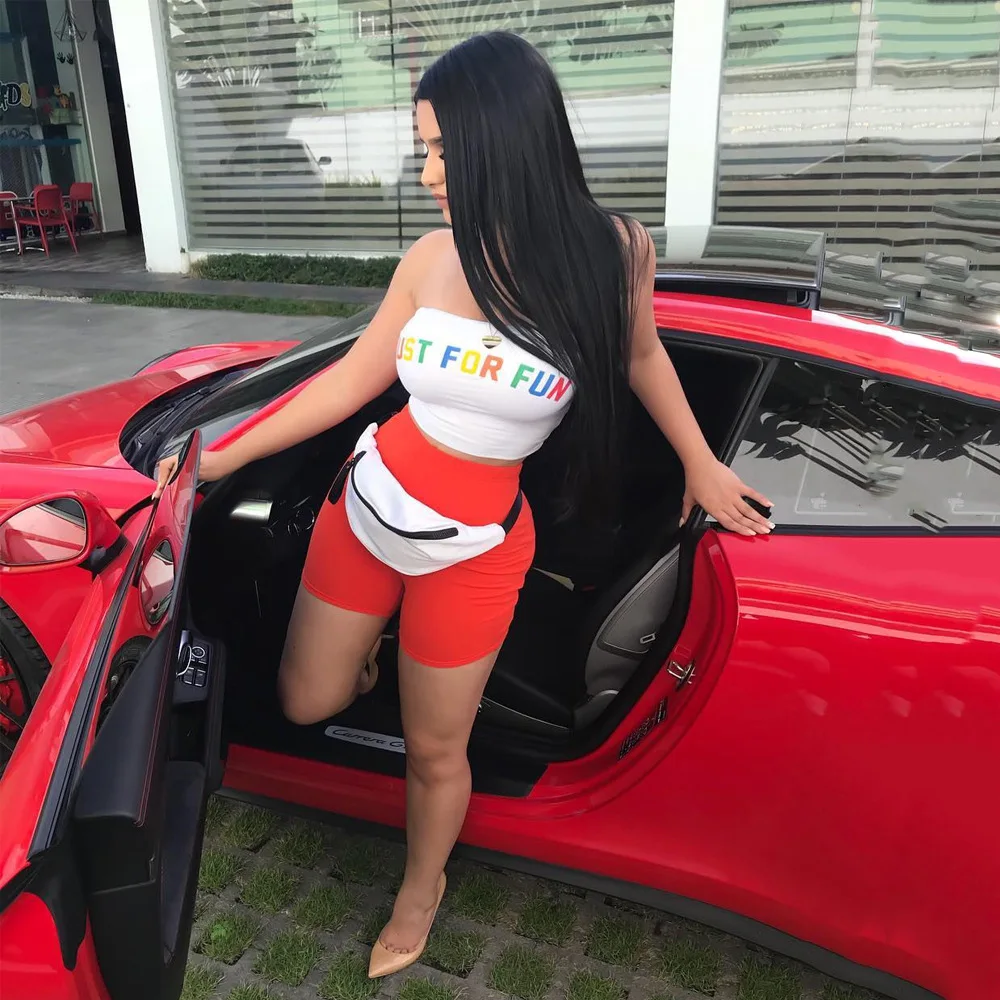 low cost Letters Print Two Pieces Set Woman Off Shoulder Wrap Chest+ Skinny Mini Tight Shorts Night Club Out