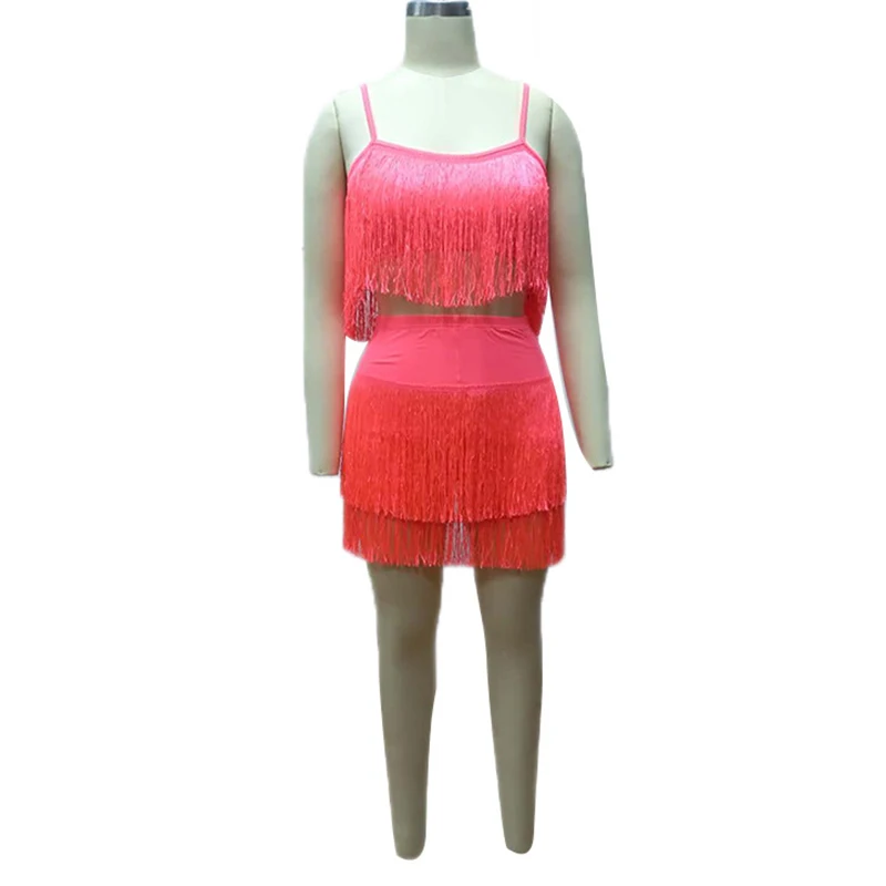 incredible Neon Green Pink Tassels Two Piece Sets Women Festival Clothes Spaghetti Strap Backless Crop Top And