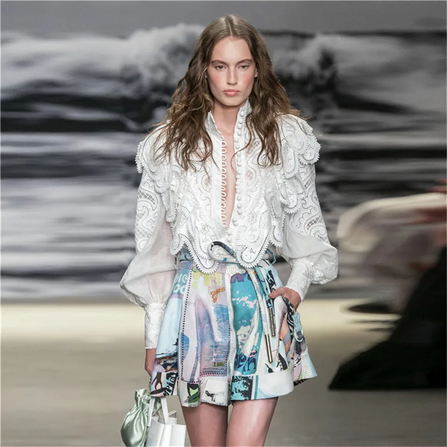 amazing Autumn 2 Piece Outfits for Women Long Sleeve Lace White Blouse and High Waist Flower Shorts Two Pie