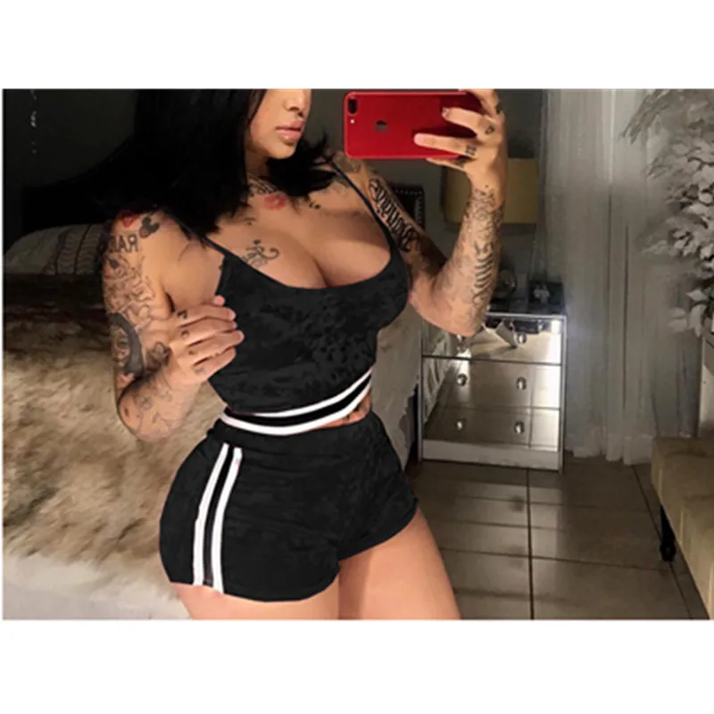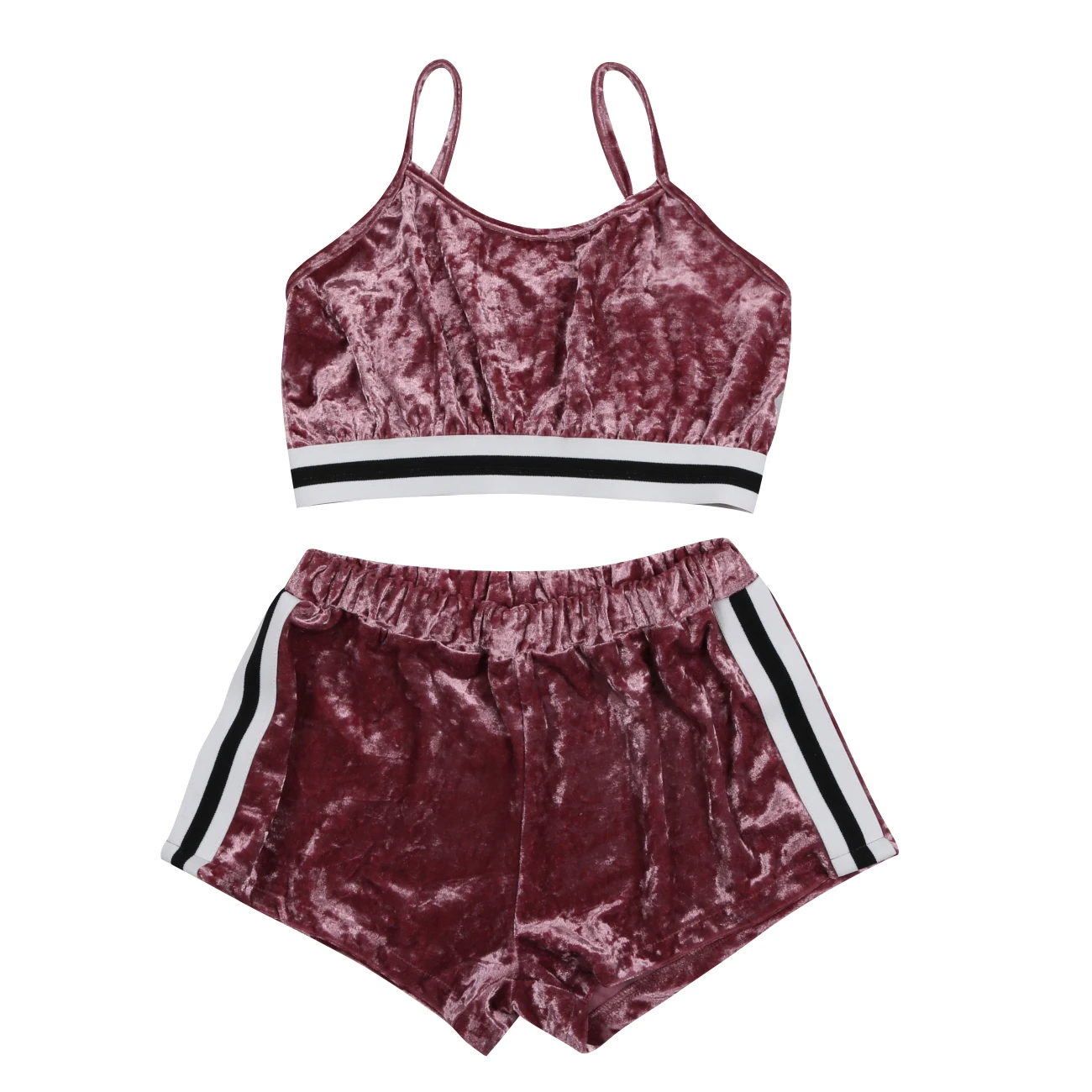 Promo 2020 Velvet Sexy 2 Piece Women Cami Crop Top with Shorts Sporting Suit Feminine Summer Striped Wome
